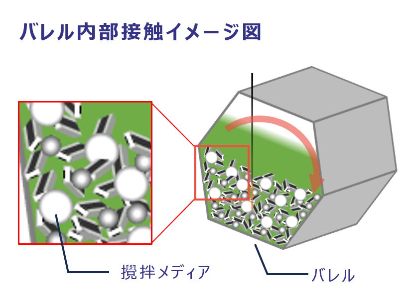 よって構造上、バレル内部で「製品同士」または「製品+撹拌メディア」の接触によってワレカケ・チッピングが発生する事があります(下図)。
